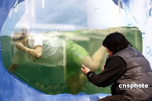 2月28日,“紅牛勇闖南北極”大型探險(xiǎn)勇士招募活動(dòng)開始在新春的北京舉行,應(yīng)募市民在活動(dòng)中挑戰(zhàn)在冰水中憋氣。在北京站招募比賽中順利闖過三關(guān)、表現(xiàn)優(yōu)異者,將有機(jī)會(huì)前往北極極點(diǎn)探險(xiǎn)!凹t牛勇闖南北極”大型探險(xiǎn)勇士招募活動(dòng)將在全中國海選出14位挑戰(zhàn)者,送往中國內(nèi)蒙古沙漠、瑞士阿爾卑斯冰川、挪威薩米人居住區(qū)等極地訓(xùn)練營展開集訓(xùn),最終會(huì)有3人獲得挑戰(zhàn)北極點(diǎn)的最后通行證。而南極探險(xiǎn)選拔活動(dòng)將在下半年進(jìn)行。中新社發(fā) 盛佳鵬 攝