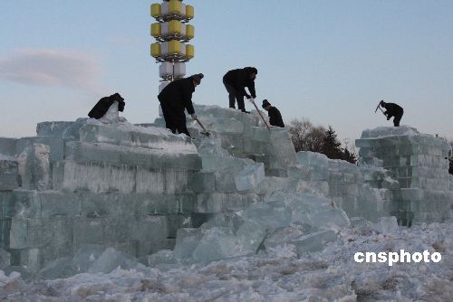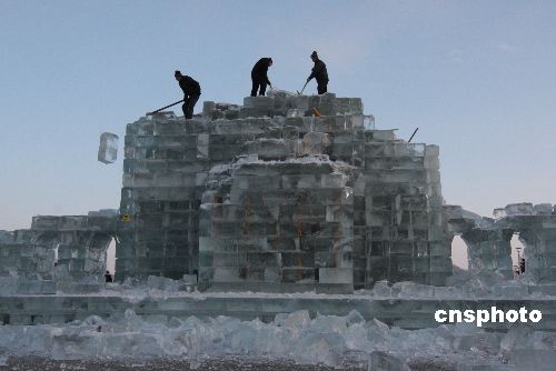 2月28日,施工人員在牡丹江市城區(qū)冰堡旅游景點(diǎn)拆除融化的冰雕作品。“立春”過(guò)后,素有“雪城”之稱的黑龍江省牡丹江市氣溫回升較快,城區(qū)內(nèi)的各大冰雪旅游景點(diǎn)的冰雪作品開(kāi)始融化,失去寒冬里的風(fēng)采。從當(dāng)日起,城區(qū)冰雪旅游景點(diǎn)管理部門(mén)對(duì)融化的冰雕作品進(jìn)行拆除。中新社發(fā) 莊文斌 攝