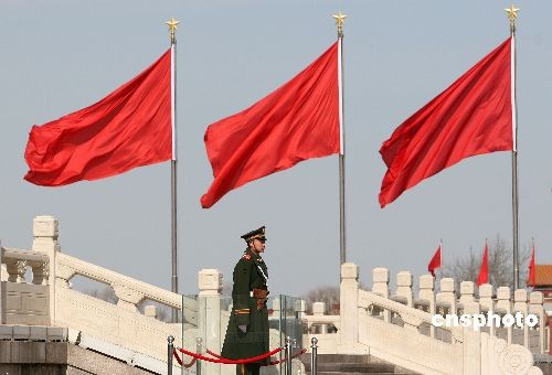 2009年3月1日,“兩會”即將召開,北京天安門廣場及周邊建筑掛起了紅旗,廣場上一片喜慶祥和氣氛。中新社發(fā) 魯谷 攝