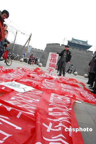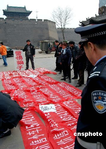 2009年3月1日,山西平遙古城,一小伙兒手持“警惕騙子”木牌,展示收繳的“低價售小車”廣告條幅在街頭展示。據(jù)了解,該小伙姓王,幾天前看了懸掛在墻頭的條幅廣告購買二手私家車,不想錢匯了,車卻沒有到手。為了不讓其他人再上當受騙,他上街四處清理這些騙人的條幅廣告,并在街頭公然向騙子宣戰(zhàn):“騙子掛一幅,我就撕一幅,決不能讓它再騙人。”中新社發(fā) 梁寶海 攝