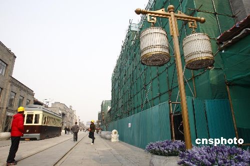 3月3日,工人正在對(duì)北京前門(mén)大街加緊施工。為迎接新中國(guó)成立60周年大慶,前門(mén)大街部分建筑已經(jīng)搭起綠網(wǎng),開(kāi)始對(duì)外壁進(jìn)行裝修工作,預(yù)計(jì)整個(gè)前門(mén)大街建筑外壁的裝修工程將于“五一”前完工。中新社發(fā) 鄭雄增 攝