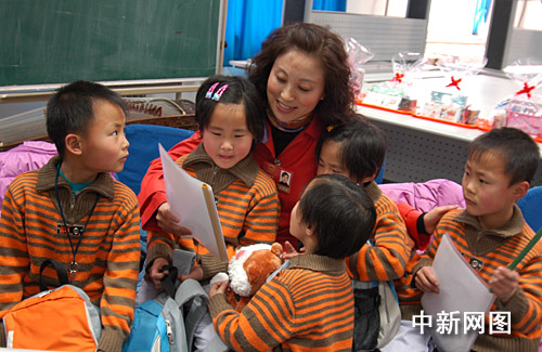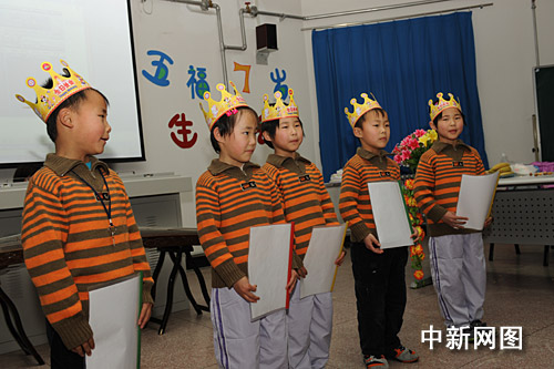 3月4日,在北京豐臺(tái)區(qū)實(shí)驗(yàn)小學(xué)就讀的河北滄州五胞胎繳福慶、繳福森、繳福莉、繳福欣、繳福源迎來7周歲生日,學(xué)校為他們舉辦了“快樂與感恩”主題班會(huì)。正在北京開“兩會(huì)”的黑龍江省全國(guó)人大代表蘇艷霞抽閑參加了生日會(huì)并向五胞胎贈(zèng)送了生日禮物,7年來,蘇艷霞女士一直關(guān)注著“五福娃”的成長(zhǎng)。王少華 張書儉 攝