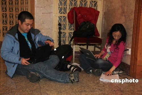 3月5日,十一屆全國人大二次會議在北京人民大會堂開幕。圖為在大會堂走廊上,采訪大會的記者席地而坐,爭取以最快的速度傳送稿件。中新社發(fā) 張婭子 攝