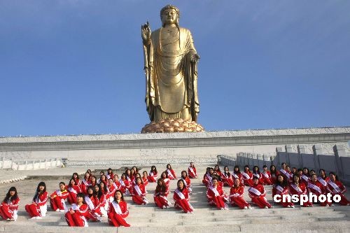 3月6日上午,來自河南各地的60名2009國際旅游小姐參賽選手匯集在河南魯山縣,在天瑞大佛前祈福求“和”,祈福中國建國60周年,祈福世界和平、社會和諧。中新社發(fā) 王中舉 攝