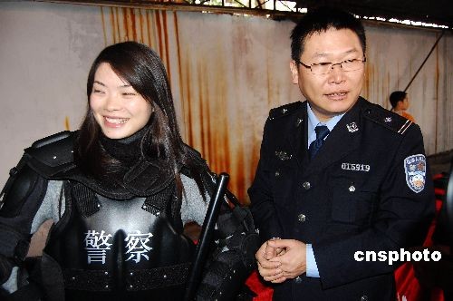 三月八日,國際婦女節(jié),廣州南沙區(qū)警方舉行“警嫂警營體驗日”活動,一位警嫂試穿老公的防爆衣英姿颯爽。中新社發(fā) 柯小軍 攝