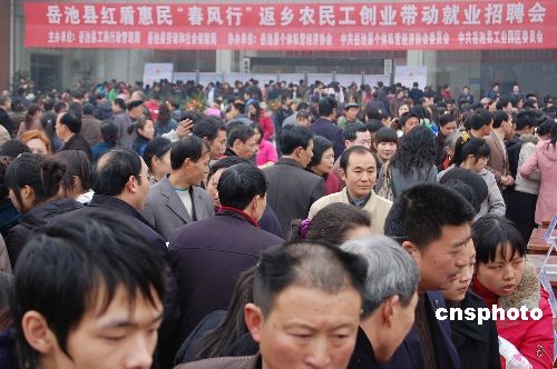 為解決農(nóng)民工就業(yè)難的問題,3月9日,四川岳池舉辦“紅盾惠民春風(fēng)行”返鄉(xiāng)農(nóng)民工創(chuàng)業(yè)帶動就業(yè)招聘會,上萬名農(nóng)民工前往應(yīng)聘。共有41個單位參與招聘,提供就業(yè)崗位3400余個。中新社發(fā) 胡佐斌 攝