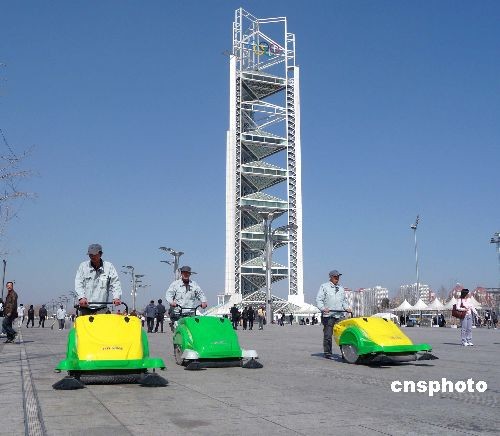 2009年3月8日,幾名保潔員正在使用新型保潔車清掃北京奧林匹克公園的地面。據(jù)介紹,北京奧運(yùn)中心區(qū)新近增添了6部手推保潔車,它操作起來(lái)輕便靈活,大大減輕了保潔人員的體力,提高了工作效率。中新社發(fā) 玉龍 攝