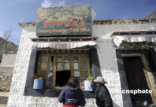 3月10日,游人在西藏拉薩哲蚌寺售票處購買參觀票。當日,哲蚌寺推出半價門票。中新社發(fā) 廖攀 攝