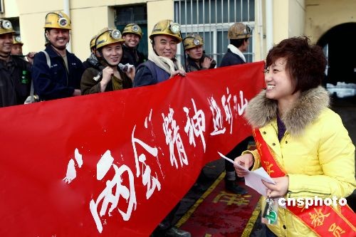 3月11日,安徽恒源煤電公司宣傳員在井口給礦工宣傳“兩會”精神。自3月5日“兩會”召開以來,安徽恒源煤電公司組織了“兩會”精神在礦山宣傳隊,向礦工們宣傳了“兩會”召開的意義和“兩會”上有關礦山安全生產、百姓切身利益等相關內容。中新社發(fā) 黃啟軍 攝