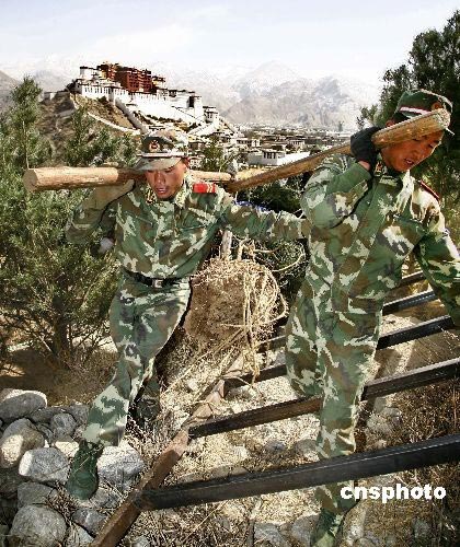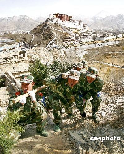 2009年3月12日,武警西藏總隊2000多名官兵來到拉薩市藥王山,揮鍬舞鎬為綠色生態(tài)拉薩增添了一片新綠。中新社發(fā) 張權 攝
