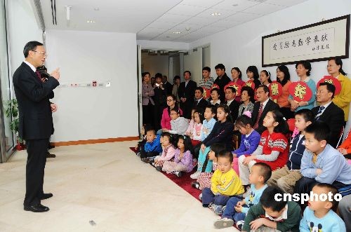 當(dāng)?shù)貢r間三月十二日,正在美國訪問的中國外交部部長楊潔篪來到中國駐美大使館視察中國250多家駐外使領(lǐng)館中的一所學(xué)!v美使館陽光學(xué)校。楊潔篪在和學(xué)校孩子們交談時鼓勵他們學(xué)說中國話,學(xué)寫中國字,學(xué)做中國人,并為陽光學(xué)校題寫校訓(xùn):“愛國勵志勤學(xué)奉獻”。圖為楊潔篪在和陽光學(xué)校老師和孩子們交流中。 中新社發(fā) 邱江波 攝