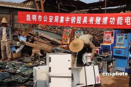 三月十三日,昆明市公安局集中銷毀賭博性游戲機(jī)及電路板共1560件,價(jià)值上百萬元人民幣。這種賭博游戲機(jī)通過無線收發(fā)器來控制內(nèi)部的電腦,達(dá)到操縱賭博結(jié)果的目的。圖為被銷毀的賭博游戲機(jī)。中新社發(fā) 劉冉陽 攝