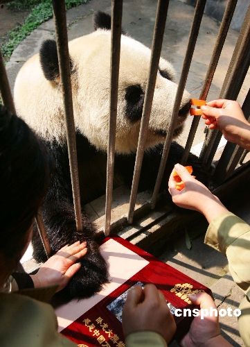 三月十三日上午,福州熊貓世界中心四只來(lái)自地震災(zāi)區(qū)的大熊貓,在特制模盤(pán)里各自踩下一個(gè)彌足珍貴的“掌印”。這四個(gè)“掌印”將作為大熊貓萬(wàn)里行感恩活動(dòng)的見(jiàn)證,送往四川臥龍大熊貓研究中心,作為永久留念保存。中新社發(fā) 楊婀娜 攝