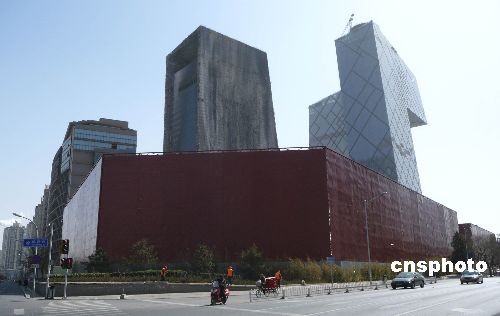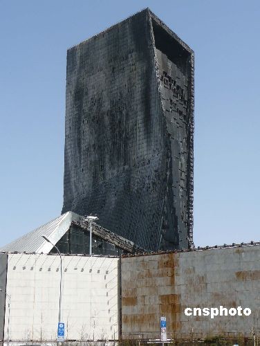 2009年3月13日,經(jīng)過(guò)半個(gè)多月的施工,北京央視新樓北配樓火災(zāi)現(xiàn)場(chǎng)旁的廣告牌搭建完畢,廣告牌已將央視北配樓部分樓體遮擋起來(lái)。中新社發(fā) 玉龍 攝