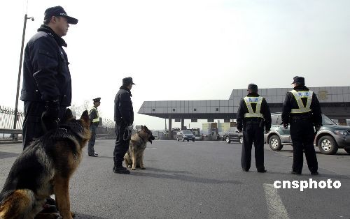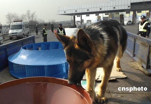 近日,北京豐臺警方在京石高速公路杜家坎收費站治安檢查站采取警員與警犬一同進(jìn)行安全檢查的措施,確保萬無一失。 杜家坎收費站位于豐臺西部和房山東部的交界地帶,地理位置非常重要,是京石高速公路進(jìn)入市區(qū)的必由之路,每天的車流量很大。中新社發(fā) 楊陽 攝