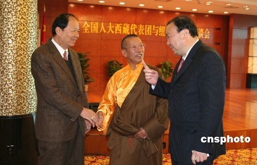 正在美國訪問的中國全國人大西藏代表團(tuán)18日與紐約當(dāng)?shù)貎S學(xué)界舉行座談,相互交流。圖為代表團(tuán)團(tuán)長、全國人大代表、西藏自治區(qū)人大常委會(huì)副主任新雜·單增曲扎活佛(中)與紐約當(dāng)?shù)貎S領(lǐng)親切交談。中新社發(fā) 魏晞 攝