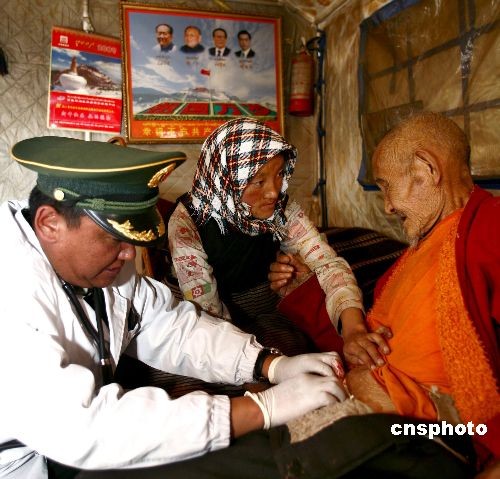 3月18日,武警西藏總隊(duì)醫(yī)院派出專家巡診團(tuán),來(lái)到拉薩市當(dāng)雄縣格達(dá)鄉(xiāng)羊易村10.6地震災(zāi)區(qū),對(duì)因在地震中受傷的10余名傷員進(jìn)行跟蹤治療,并為其他災(zāi)民進(jìn)行了春季防病知識(shí)宣講及診斷治療。 中新社發(fā) 張權(quán) 攝