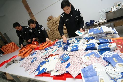 3月18日,河南許昌市魏都公安分局民警在涉嫌制造假藥窩點統(tǒng)計查獲的假藥及藥品標簽、藥盒等。當日,魏都警方接群眾舉報,在一閑置廠房內(nèi)查獲涉嫌制造假藥窩點,當場查扣涉嫌假冒藥品10多種,半成品藥品、包裝箱、合格證、防偽標識等1000多件,涉案值達2000余萬元。假冒藥品有五豆平糖膠囊、腎金子、腎黃金、協(xié)和降脂等10多種,藥效包含降壓、減肥、壯陽滋補等。藥品的制假技術(shù)很高,須借助儀器檢測才能區(qū)別。此案正在進一步調(diào)查處理中。中新社發(fā) 牛書培 攝