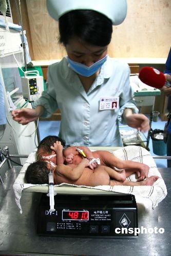 三月十九日,湖南省兒童醫(yī)院對(duì)剛剛轉(zhuǎn)診到醫(yī)院的一對(duì)連體女?huà)脒M(jìn)行詳細(xì)全身檢查,初步診斷為對(duì)稱(chēng)性劍-臍連體女?huà),胸骨下端與臍部腹壁相連、共肝,病情危重。十六日八時(shí)許,二十八歲的段曉艷在湖南婁底新化縣中醫(yī)院婦產(chǎn)科剖腹分娩出這對(duì)連體女?huà),體重四點(diǎn)八公斤。中新社發(fā) 李奇 攝