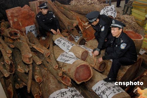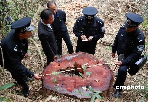 3月20日,江西省婺源縣森林公安局民警在案發(fā)現(xiàn)場(chǎng)對(duì)砍伐后的紅豆杉進(jìn)行偵察。紅豆杉是國(guó)家一級(jí)重點(diǎn)保護(hù)野生植物。經(jīng)鑒定,被盜的一株蔸部直徑為1.07米,活立木蓄積7.494立方米,樹(shù)齡為670年以上;另一株蔸部直徑為0.88米,活立木蓄積4.310立方米,樹(shù)齡為550年以上,總蓄積量達(dá)11.804立方米。目前,紅豆杉已經(jīng)全部追回,14名犯罪嫌疑人員全部到案歸捕,目前此案正在進(jìn)一步審理當(dāng)中。 中新社發(fā) 王國(guó)紅 攝