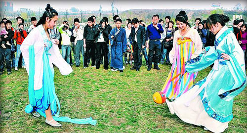 3月29日,農(nóng)歷三月三上巳節(jié),是中國(guó)傳統(tǒng)的“女兒節(jié)”。西安一群愛好漢服的女子來到唐城墻遺址公園的吟詩(shī)壇里秀風(fēng)采。幾個(gè)女孩子以古代名畫《女史箴圖》為藍(lán)本,以情景劇形式表現(xiàn)中國(guó)古代貴婦的妝容文化。旁邊還配有專業(yè)人士指導(dǎo)并現(xiàn)場(chǎng)解說,向大家介紹中國(guó)古代婦女的妝容。隨后,她們又到曲江池遺址公園湖邊,舉行祓禊祈;顒(dòng),并踢起了球。