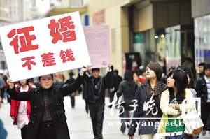 “征婚,不差錢”。30日下午,在南京新街口正洪街廣場(chǎng),一名青年女子高舉寫著這五個(gè)大字的廣告牌,從逛街的人流中走過(guò),雷人的廣告詞引來(lái)眾多市民圍觀。緊跟在后面一名中年男子舉著另一塊廣告海報(bào),密密麻麻的文字揭示了其中的玄機(jī)。原來(lái),中年男子是南京一家婚介公司的負(fù)責(zé)人,此舉是為北方某地一千萬(wàn)富翁征婚。記者通過(guò)QQ聯(lián)系采訪了這名富翁,得知這位北方漢子竟對(duì)南京女孩情有獨(dú)鐘,執(zhí)意要在南京找到另一半。