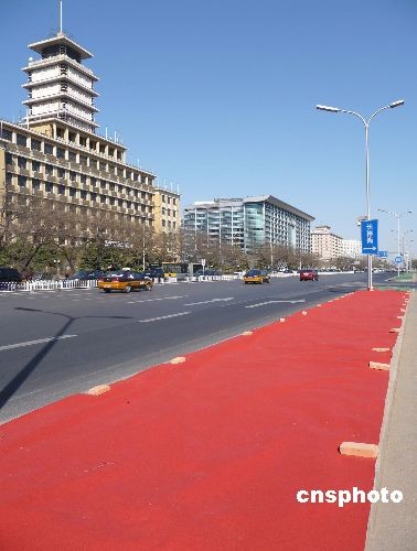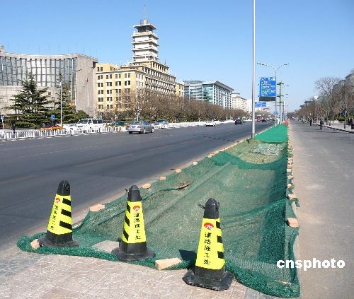 2009年4月1日,北京長(zhǎng)安街復(fù)興門南側(cè)路段機(jī)動(dòng)車道和非機(jī)動(dòng)車道之間的綠化帶已拆除,為了防止揚(yáng)塵現(xiàn)象的產(chǎn)生,原綠化帶的地面上全都鋪設(shè)了各色遮擋物。民族文化宮南側(cè)的施工人員正在加緊遷移路邊的樹木,這些都標(biāo)志著長(zhǎng)安街拓寬工程開(kāi)始進(jìn)入實(shí)施性進(jìn)展階段。 中新社發(fā) 玉龍 攝