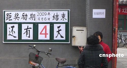 2009年4月2日,北京西長安街拆遷辦旁設(shè)立的獎勵期已進(jìn)入倒計時第4天。近日,為鼓勵拆遷戶提前搬走,拆遷辦設(shè)立了獎勵期。據(jù)悉,4月6日前簽訂協(xié)議的,每戶給予提前搬家獎勵2.5萬元,重點工程配合獎勵5萬元,合計7.5萬元?紤]到居民周轉(zhuǎn)的困難,還將對此部分居民給予一次性周轉(zhuǎn)補貼1000元/平方米。4月6日后,未簽訂協(xié)議的被視為放棄獎勵。 截至目前,拆遷范圍內(nèi)的36家單位已全部與拆遷辦簽訂拆遷協(xié)議,大部分單位已開始騰退房屋。而拆遷區(qū)內(nèi)大部分住戶也簽訂了拆遷協(xié)議,部分住戶已購置了兩限房,搬進(jìn)了新家。 中新社發(fā) 玉龍 攝