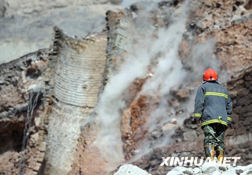 目前,救援工作仍在進行中。由于石灰窯窯口前的臺地面積很小,且有一條大裂縫,消防車一時難以駛?cè);消防人員用高壓水槍作業(yè)時,水一噴上去窯體即不斷塌方,救援難度較大。