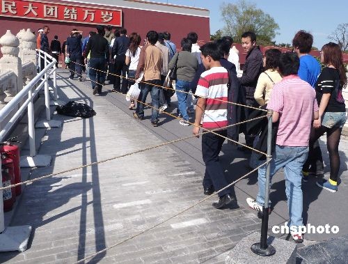2009年4月6日,北京天安門金水橋第一階段修繕工程結(jié)束,東二橋和西二橋的青磚橋面已鋪上地毯供游人臨時(shí)通過。據(jù)悉,下一階段將在橋上架設(shè)棧道,棧道將滿鋪木板,能夠承受游人活動(dòng)等所產(chǎn)生的荷載強(qiáng)度等。為便于今后金水橋橋面的排水和通風(fēng),新修的棧道將架空于橋面。棧道與橋面支撐處采取彈性相接,并選擇橋面范圍以外的地方進(jìn)行固定。中新社發(fā) 玉龍 攝