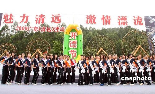 4月18日,“魅力清遠(yuǎn) 激情漂流”開漂節(jié)的啟動(dòng)儀式在廣東省清遠(yuǎn)市舉行,參加2009國(guó)際旅游小姐中國(guó)區(qū)總決賽的61位佳麗在儀式上亮相。在接下來的10天里,選手們將參觀游覽清遠(yuǎn)的特色景點(diǎn),參加一系列的清遠(yuǎn)旅游宣傳推廣活動(dòng)。新一屆的國(guó)際旅游小姐大賽中國(guó)冠軍將在28日產(chǎn)生。 中新社發(fā) 劉鷹 攝