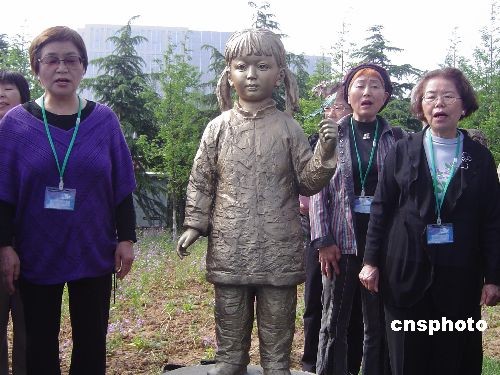4月18日,由日本和平友好人士倡議并捐資塑造、象征和平的“紫金花女孩”銅像在侵華日軍南京大屠殺遇難同胞紀(jì)念館和平公園內(nèi)落成,該銅像高1.17米,表現(xiàn)的是抗日戰(zhàn)爭時(shí)期一個(gè)7、8歲的南京女孩,站立在周圍開滿紫金花的一塊山石上,睜大著雙眼看著那個(gè)戰(zhàn)亂的世界。圖為前來參加銅像揭幕儀式的日本紫金草訪華團(tuán)一行20多人在銅像旁唱起“和平之歌”。中新社發(fā) 王國安 攝