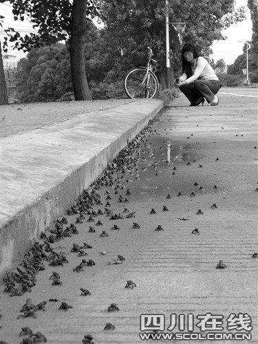 一夜起來,水庫岸邊,數(shù)以萬計(jì)的幼小蟾蜍一蹦一跳地上了岸,一時(shí)間,公路上、道路邊、居民房墻壁上,密密麻麻的蟾蜍讓當(dāng)?shù)鼐用窨吹谩靶念^發(fā)麻”。截至昨日,上述現(xiàn)象已在眉山丹棱縣縣城附近豐樂水庫邊出現(xiàn)了好幾天。據(jù)丹棱縣林業(yè)局野生動(dòng)物保護(hù)辦主任方元介紹,此乃蟾蜍遷徙生長的自然現(xiàn)象。