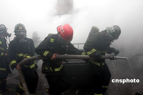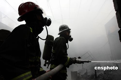 4月20日5時34分,安徽省濉溪縣虎山路東側口子批發(fā)市場附近一漁畜具倉庫發(fā)生火災;幢笔邢乐ш犗群笳{動3個中隊9輛消防水罐車、2輛消防指揮車, 80名官兵前往火場滅火。明火于早晨8時被撲滅。此次火災過火面積150平方米左右,無人員傷亡。在撲救過程中,共搶救危險品8桶桐油、6罐氧氣瓶,疏散被困人員近200人。目前火災損失和起火原因正在進一步調查中。中新社發(fā) 萬善朝 攝