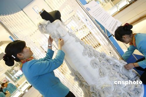4月26日,世界上僅三件的鉑金婚紗之一亮相北京國(guó)華商場(chǎng),上面墜滿了由鉑金絲線和鉑金珠子縫制的白色花朵,吸引不少顧客的目光。這件價(jià)值75萬美元(約合500多萬人民幣)的“金貴”婚紗,是由國(guó)際鉑金協(xié)會(huì)邀請(qǐng)世界著名設(shè)計(jì)師Vivienne Tam經(jīng)過近一年時(shí)間的創(chuàng)作完成,她巧妙地將中西文化相融合,大膽地將中國(guó)的國(guó)花——牡丹作為創(chuàng)意元素。圖為工作人員正在整理鉑金婚紗。中新社發(fā) 鄭雄增 攝