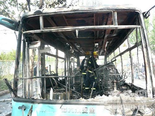記者趕到現(xiàn)場(chǎng)時(shí),火勢(shì)已經(jīng)被基本控制,多名消防隊(duì)員還在噴水撲滅余火,現(xiàn)場(chǎng)彌漫著濃烈的焦糊味。記者看到,該輛公交車已被燒得面目全非,僅剩下了一個(gè)鐵骨架,后側(cè)輪胎也已被燒得爆裂。