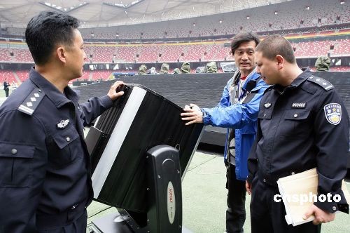 4月29日,北京警方等相關(guān)部門(mén)對(duì)成龍鳥(niǎo)巢演唱會(huì)的現(xiàn)場(chǎng)進(jìn)行全面安全檢查。成龍演唱會(huì)是奧運(yùn)會(huì)后鳥(niǎo)巢迎來(lái)的第一個(gè)大型活動(dòng),屆時(shí)到鳥(niǎo)巢觀看演唱會(huì)的觀眾將超過(guò)5萬(wàn)人。中新社發(fā) 李連杰 攝