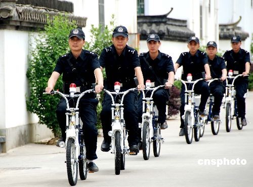 5月5日,江西婺源的大街小巷的城區(qū)出現(xiàn)了一支特警自行車治安巡邏隊。他們騎乘統(tǒng)一配發(fā)的輕便自行車,車前掛有“巡警110”標志,車后配備便民服務箱。為群防群治,共織平安網,婺源縣公安局特警大隊由60人組成的一個特色 “警務自行車巡邏隊”,以適應該縣轄內小街巷多、警車巡邏不易覆蓋的治安特點。同時利用自行車巡邏既環(huán)保、便捷、無噪音,又可增加古城小道的見警率,還避免了機動車頻繁流動造成的道路擁堵, 大大提高“走街串巷”治安巡防的效率,延伸了公安機關對社會面的防控觸角。 中新社發(fā) 王國紅 攝