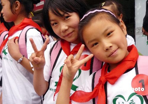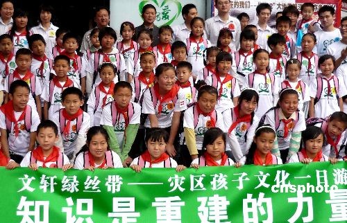 5月7日,在汶川地震一周年前夕,來(lái)自汶川災(zāi)區(qū)的百名小朋友在成都參加 “文軒綠絲帶--災(zāi)區(qū)孩子一日游”啟動(dòng)儀式,是次活動(dòng)以“知識(shí)是重建的力量”為主題,向?yàn)?zāi)區(qū)小朋友捐贈(zèng)兒童讀物,通過(guò)綠絲帶一日游活動(dòng),使災(zāi)區(qū)少年兒童健康快樂(lè)生活、樹(shù)立堅(jiān)強(qiáng)、堅(jiān)韌積極向上的生活態(tài)度,體驗(yàn)書與愛(ài)的力量。圖為參加“文軒綠絲帶--災(zāi)區(qū)孩子一日游”啟動(dòng)儀式的災(zāi)區(qū)小朋友。中新社發(fā) 錢興強(qiáng) 攝