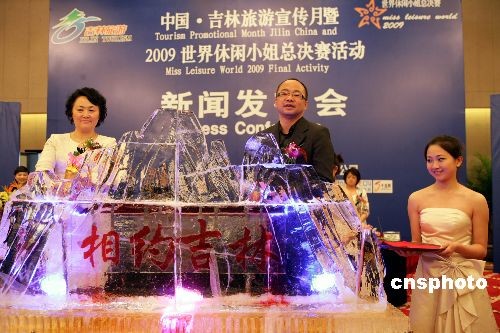 4月10日,由吉林省旅游局主辦的“中國·吉林旅游宣傳月暨2009世界休閑小姐總決賽”新聞發(fā)布會暨啟動儀式在北京舉行。此次活動將邀請來自全球80個國家和地區(qū)的休閑小姐、20國駐華大使及夫人、100家新聞媒體,走進吉林、歡聚吉林,借助“美麗經(jīng)濟”,讓世界了解吉林,讓吉林走向世界。在6月28日舉行的總決賽上,通過民族服飾展示、泳裝展示、旗袍展示、晚裝展示、才藝展示等環(huán)節(jié),評選出2009世界休閑小姐總決賽前5名及各類單項獎。中新社發(fā) 趙雋 攝