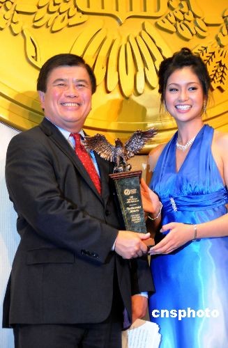 七月二十三日晚,國(guó)際領(lǐng)袖基金會(huì)在華盛頓舉行頒獎(jiǎng)晚會(huì),在美國(guó)國(guó)會(huì)中僅有的兩名華裔議員吳振偉、趙美心分別獲得“年度杰出公職服務(wù)獎(jiǎng)”。圖為美國(guó)首位華裔眾議員吳振偉領(lǐng)取“年度杰出公職服務(wù)獎(jiǎng)”。國(guó)際領(lǐng)袖基金會(huì)為全美最著名的亞裔青年領(lǐng)袖訓(xùn)練機(jī)構(gòu),每年定期表?yè)P(yáng)促進(jìn)國(guó)際經(jīng)貿(mào)繁榮、發(fā)揚(yáng)中華文化傳承有卓越成就的杰出人士。中新社發(fā) 吳慶才 攝