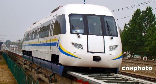 6月15日,中國(guó)首列具有完全自主知識(shí)產(chǎn)權(quán)的實(shí)用型常導(dǎo)中低速磁懸浮列車(chē),在中國(guó)北車(chē)集團(tuán)唐山軌道客車(chē)有限公司下線并完成調(diào)試,開(kāi)始進(jìn)行線路運(yùn)行試驗(yàn),標(biāo)志著中國(guó)已具備中低速磁懸浮列車(chē)產(chǎn)業(yè)化的制造能力。該列車(chē)為3輛編組模式,車(chē)體采用鋁合金與鋁蜂窩鉚焊混合超輕車(chē)體結(jié)構(gòu),流線型,全車(chē)各部件采用輕型、環(huán)保材料,內(nèi)部裝飾造型簡(jiǎn)潔明快、舒適美觀,裝有空調(diào)、影音及廣播系統(tǒng)。運(yùn)行時(shí)速一般在120公里,使用壽命在25年以上。圖為試運(yùn)行中的中國(guó)首列實(shí)用型中低速磁懸浮列車(chē)。中新社發(fā) 翟羽佳 攝
