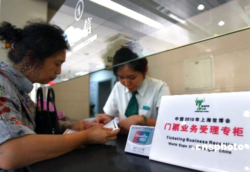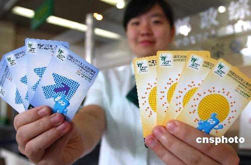 7月1日,中國(guó)2010年上海世界博覽會(huì)的指定日普通票和平日普通票開(kāi)始向境內(nèi)外個(gè)人發(fā)售。民眾可在中國(guó)郵政、中國(guó)移動(dòng)、交通銀行、中國(guó)電信4家指定銷(xiāo)售代理商全國(guó)范圍內(nèi)的2796個(gè)銷(xiāo)售網(wǎng)點(diǎn)購(gòu)買(mǎi)門(mén)票。中新社發(fā) 富田 攝