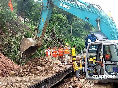 經(jīng)過上千名鐵路職工和武警官兵24小時不間斷搶修,暴雨天氣引發(fā)巖石崩塌而被迫中斷的滬昆鐵路,在中斷40小時后于2009年7月8日7時18分恢復通車。