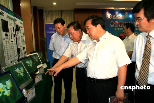 7月20日上午,揚州舉行由某集團(tuán)自主研發(fā)的LED顯示終端系列產(chǎn)品發(fā)布會并現(xiàn)場進(jìn)行展示,凸顯LED終端顯示應(yīng)用產(chǎn)品在健康、節(jié)能、環(huán)保和超薄、時尚等方面超前的理念。揚州市委書記季建業(yè)、市長王燕文等出席。季建業(yè)(右二)表示,揚州要著力推動綠色新能源產(chǎn)業(yè)的技術(shù)向高端突破,產(chǎn)品向終端延伸,推出“五個一”計劃,即1000萬臺LED顯示器、1000萬臺LED電視機(jī)、1000萬臺一體化筆記本電腦、1億盞LED燈、1億本E-book。到2012年,新能源、新光源產(chǎn)業(yè)實現(xiàn)產(chǎn)值“雙千億”。中新社發(fā) 崔佳明 攝