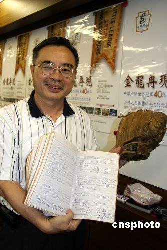 7月3日,臺灣棒球協(xié)會等單位在臺北舉行記者會,宣布將于4日起舉行棒球紀(jì)念展,再現(xiàn)40年前金龍少棒隊(duì)獲得世界少棒冠軍的傳奇。圖為主辦單位展示“文物”級棒球手套及一位名教頭的棒球指導(dǎo)筆記。1969年,金龍少棒隊(duì)載譽(yù)歸來,臺北市鞭炮齊鳴,數(shù)十萬人走上街頭,盛極一時(shí),亦成為臺灣民眾至今津津樂道的共同記憶。中新社發(fā) 董會峰 攝