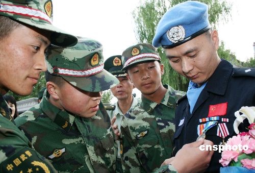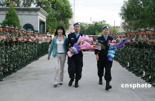 6月17日,出色完成海地維和使命的中國第七支赴海地維和警察防暴隊(duì)成員、新疆博爾塔拉蒙古自治州公安某部警官楊良、崔繼偉和李強(qiáng)載譽(yù)歸來,受到了社會(huì)各界的熱烈歡迎。該防暴隊(duì)由新疆公安邊防總隊(duì)獨(dú)立組建,于2008年8月代表中國政府、中國警察遠(yuǎn)征海地,圓滿完成為期10個(gè)月的聯(lián)合國海地任務(wù)區(qū)維和任務(wù)。中新社發(fā) 杜偉 攝