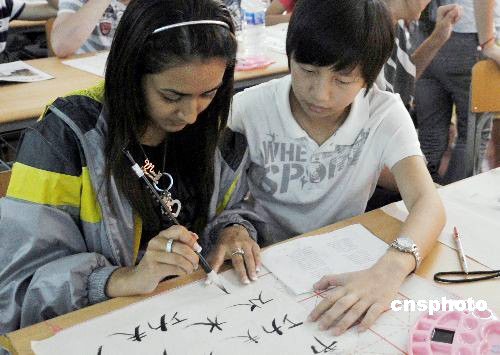 7月24日,正在重慶參加“漢語橋——英國學(xué)生夏令營”的33名英國中學(xué)生在認真學(xué)習(xí)寫漢字!肮Ψ颉、“茶”、“瓷器”等富有濃郁中國傳統(tǒng)文化的字詞,成為他們學(xué)得最快最好的漢字。由英國兒童學(xué)校和家庭部、中國國家漢語國際推廣領(lǐng)導(dǎo)小組辦公室共同主辦的“漢語橋——英國學(xué)生夏令營”20日在重慶開營。中新社發(fā) 郭晉嘉 攝