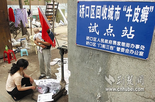 昨日(19日)上午,武漢市(湖北)硚口區(qū)易家墩街古三廢品回收站外,掛上“回收城市‘牛皮癬’試點站”的招牌,以高出普通廢紙2倍多的價格收購“牛皮癬”,激發(fā)了不少居民的除“癬”熱情。