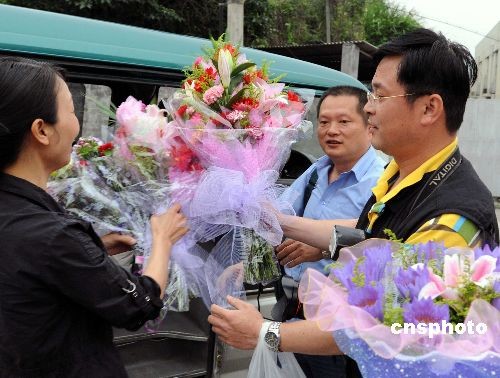 5月27日傍晚,在福州定點(diǎn)場(chǎng)所解除醫(yī)學(xué)觀(guān)察后,兩名福建省首例輸入性甲型H1N1流感確診患兒同機(jī)接觸者接受親友(左一)贈(zèng)送的鮮花。當(dāng)日,福建省衛(wèi)生廳在其網(wǎng)站上發(fā)布福建省甲型H1N1流感防控信息通報(bào),截止5月26日24:00,衛(wèi)生部通報(bào)福建省首例輸入性甲型H1N1流感確診患兒病情進(jìn)一步好轉(zhuǎn),無(wú)咳嗽及流涕,無(wú)并發(fā)癥,精神狀態(tài)良好,體溫正常,已連續(xù)3天體溫低于37℃。根據(jù)專(zhuān)家組的意見(jiàn),該患兒同機(jī)的30名在閩密切接觸者隔離醫(yī)學(xué)觀(guān)察期限為5月27日20時(shí)。屆時(shí)密切接觸者如無(wú)特殊情況,即按期解除醫(yī)學(xué)觀(guān)察;純河H屬及就診過(guò)程中的8名密切接觸者將按其與患兒脫離接觸的時(shí)間起算,隔離滿(mǎn)7日后,陸續(xù)解除醫(yī)學(xué)觀(guān)察。中新社發(fā) 劉可耕 攝